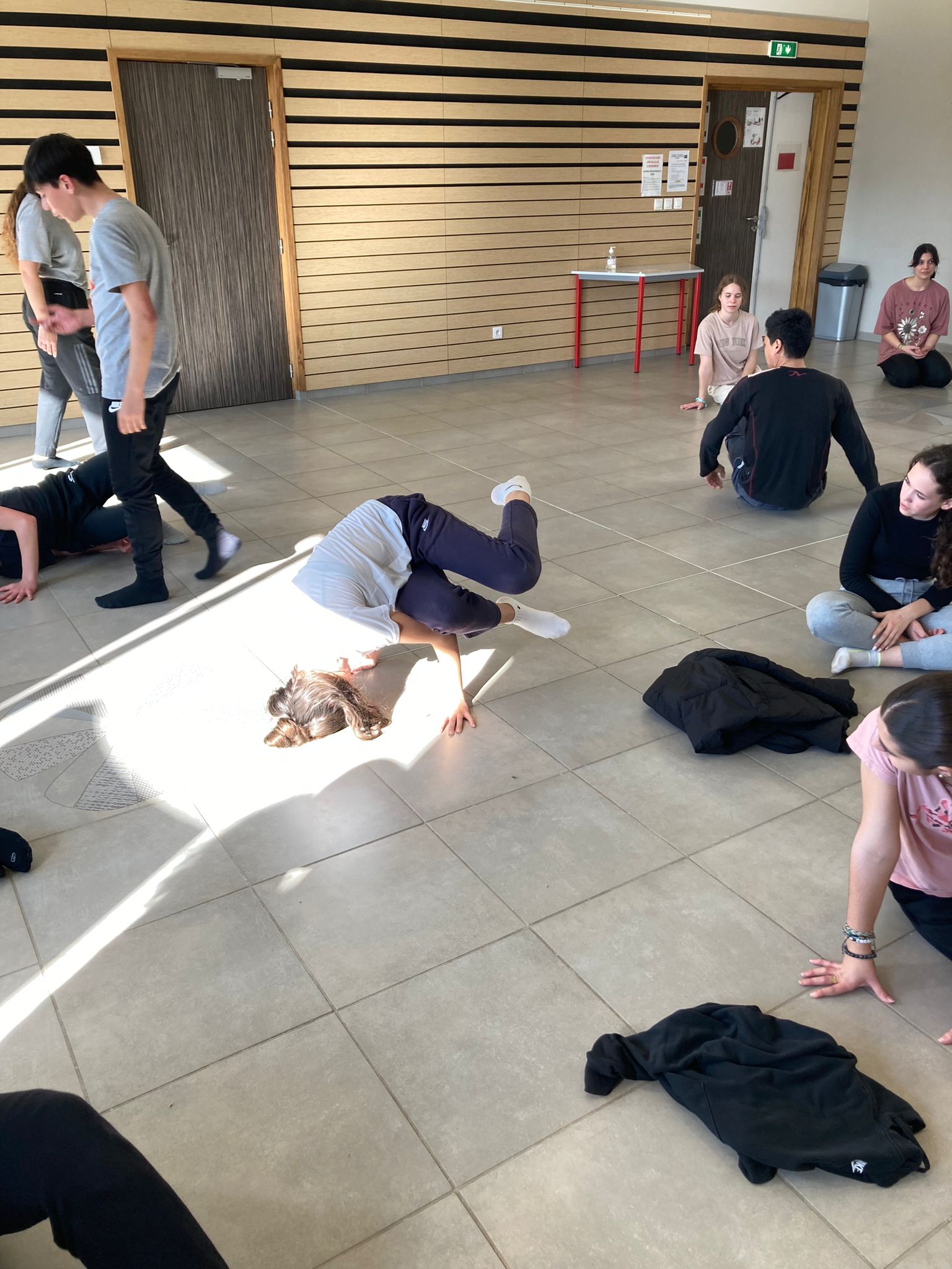Nous nous sommes réunis pour quatre ateliers de trois heures, au foyer du théâtre de Montélimar (3 ateliers) et dans la salle Bardet du collège (1 atelier). De vraies bulles consacrées à la danse au cours desquelles chacun a pu éprouver son corps, dépasser des limites, s’améliorer, surmonter des difficultés. Olé et John nous ont aidés dans la construction de la chorégraphie pour Môm’danse, en nous permettant de construire quelques phrases dansées ou en travaillant certains mouvements ou enchaînements exigeants que les élèves souhaitaient réaliser.