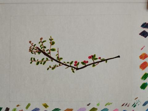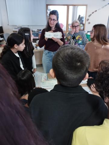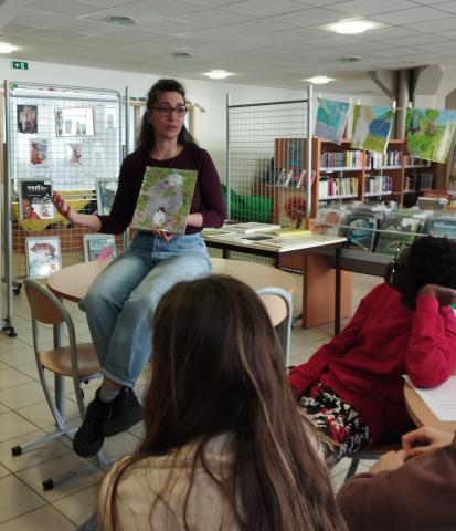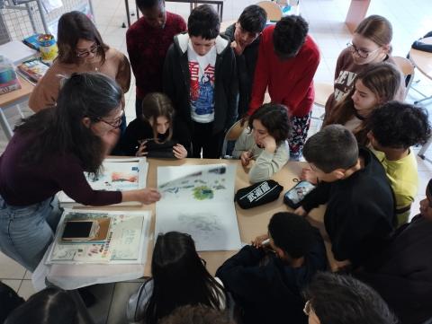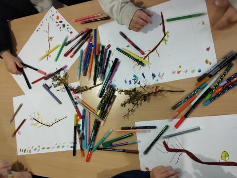 6e3 CDI - 16/03/2026 - Rencontre & Atelier de pratique artistique On a échangé et travaillé avec Sylvie BELLO à partir de son album L'ourse et l'enfant (La Partie) Sylvie BELLO partage sa démarche de création en montrant ses carnets de croquis et recherches Dessiner au feutre d'après nature, en observant un végétal, en mixant les couleurs